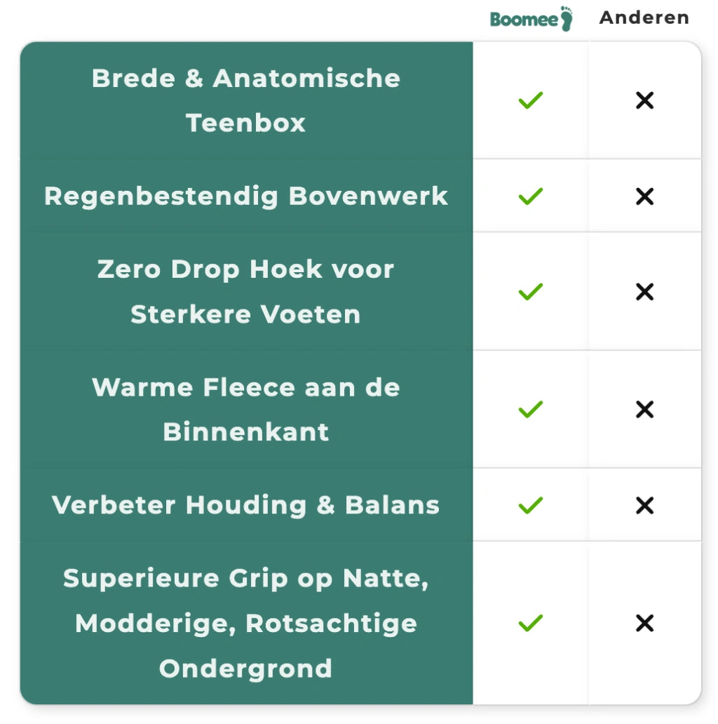 Onze Boomee-schoenen zijn vakkundig gemaakt voor dagelijks gebruik, werk en buitenavonturen en zorgen voor ongeëvenaard comfort en ondersteuning. Aanbevolen door orthopedische en podotherapeutische specialisten vanwege hun ergonomische ontwerp, ze zijn perfect voor het verbeteren van de voetgezondheid en het verminderen van pijn. Stap met vertrouwen in de wetenschap dat u in goede handen bent - zowel voor uw avonturen als voor uw voetgezondheid.